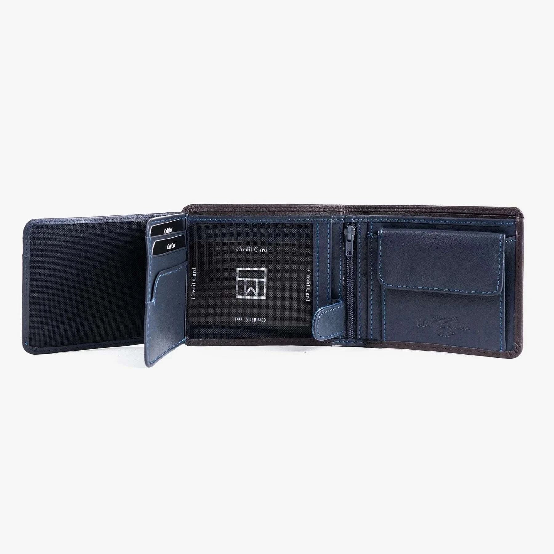 El diseño del billetero es impresionante, con un pespunte en color azul y piel interior en color azul en contraste, lo que le da un toque de elegancia y sofisticación. Además, está diseñado en España, lo que garantiza su calidad y estilo.