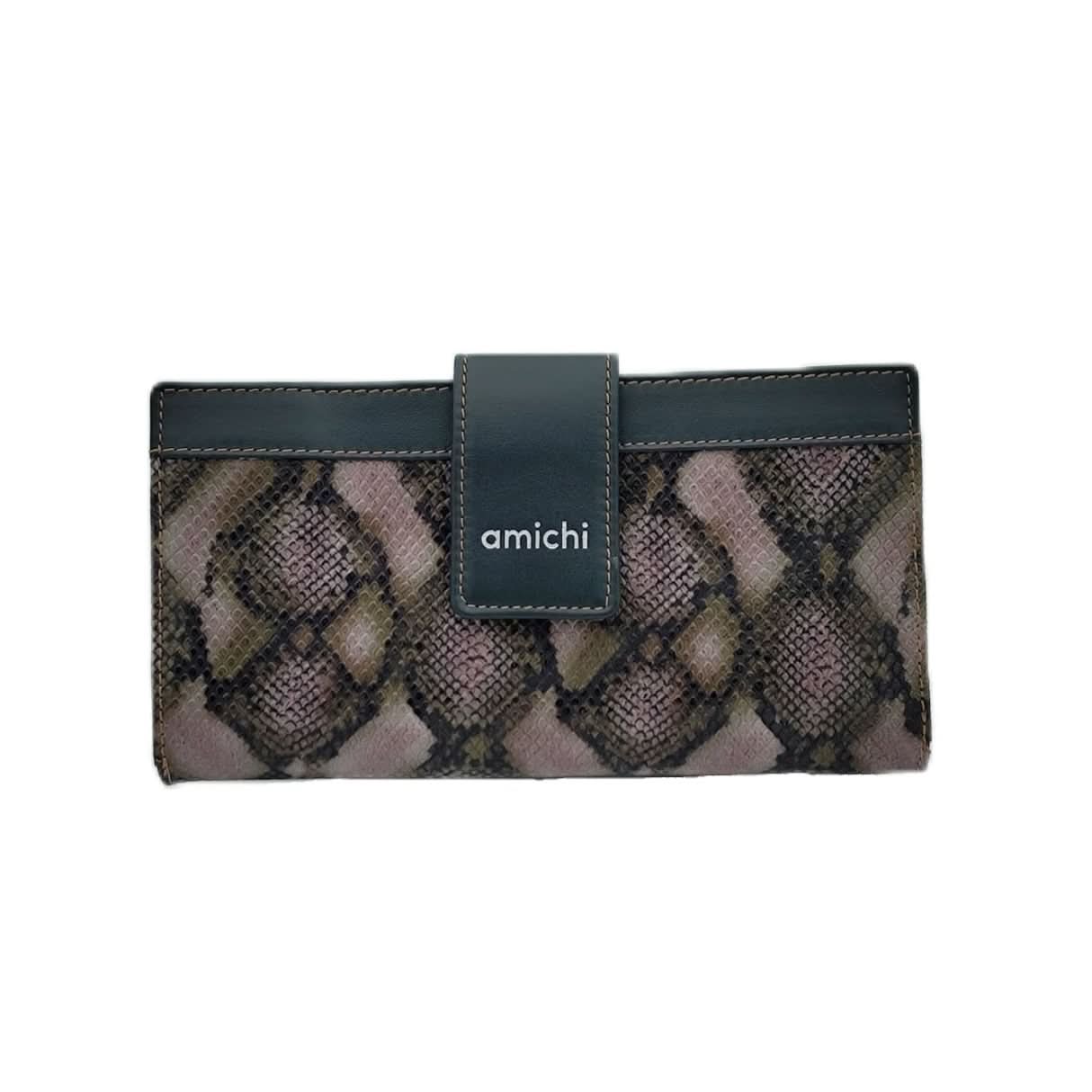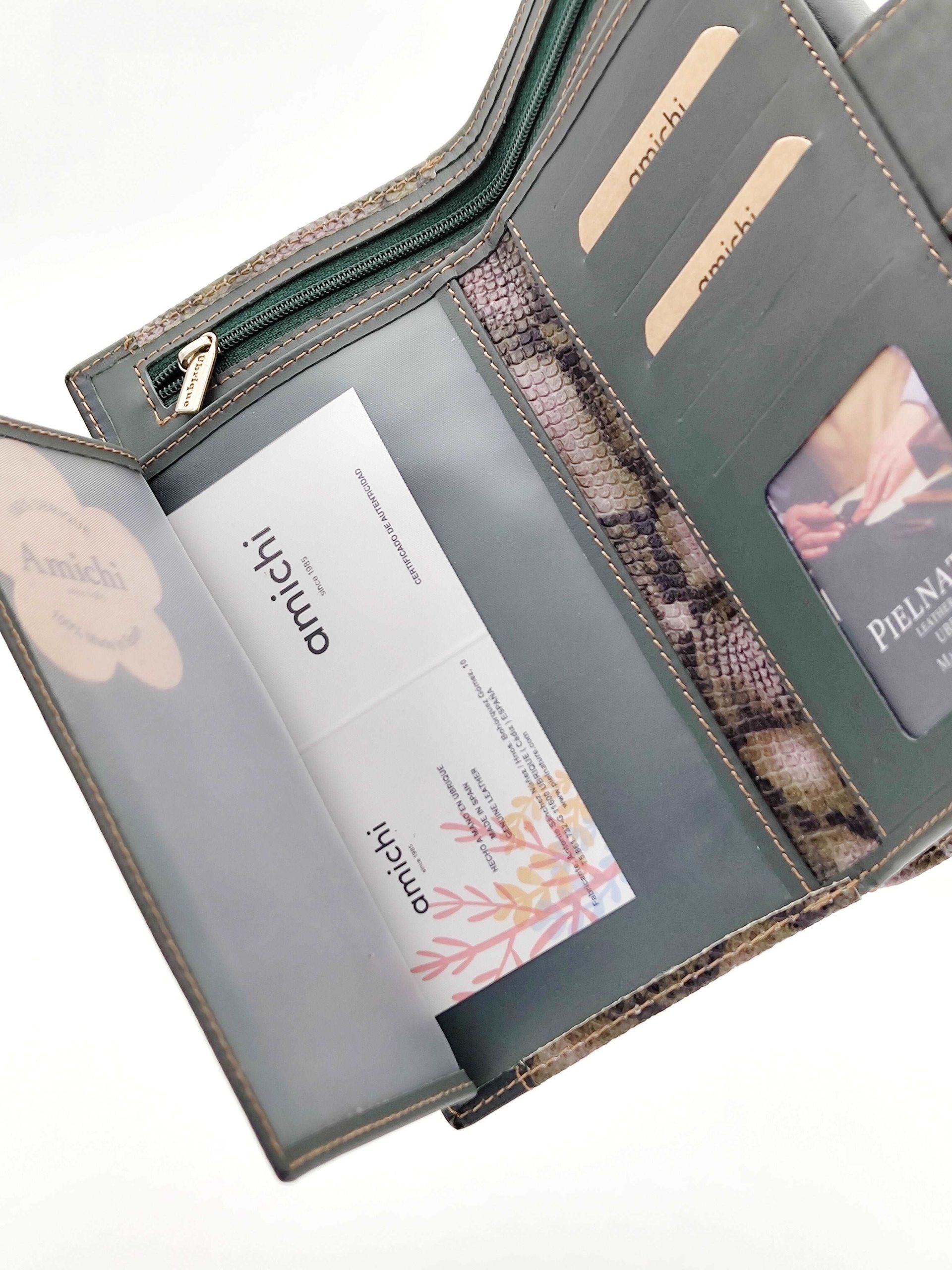 Billetero para Señora fabricado en Piel Vacuno Soft. De gran capacidad dispone de 12 compartimentos para tarjetas, 2 transparentes de fácil visualización, cremallera y compartimento para billetes. En la parte trasera dispone de monedero con doble compartimento y cremallera para ticket. Pertenece a la marca AMICHI.