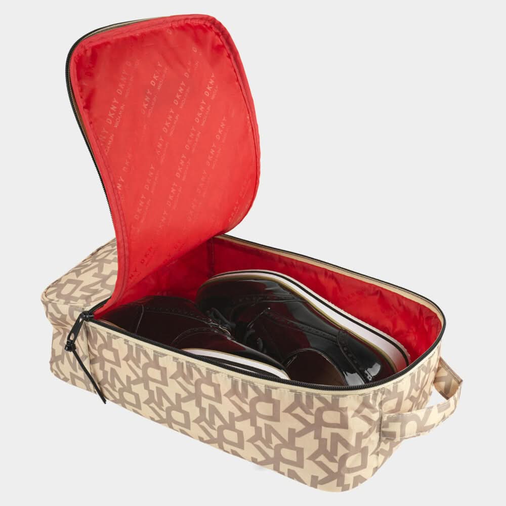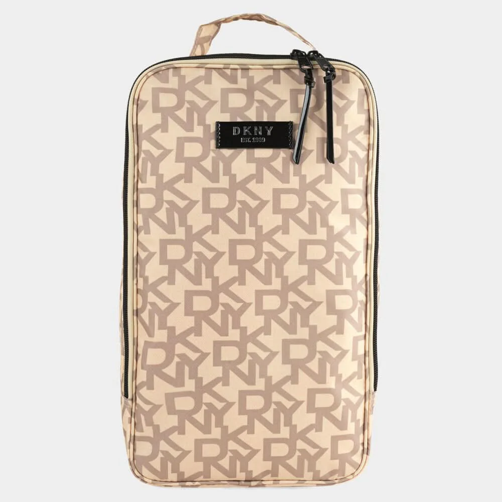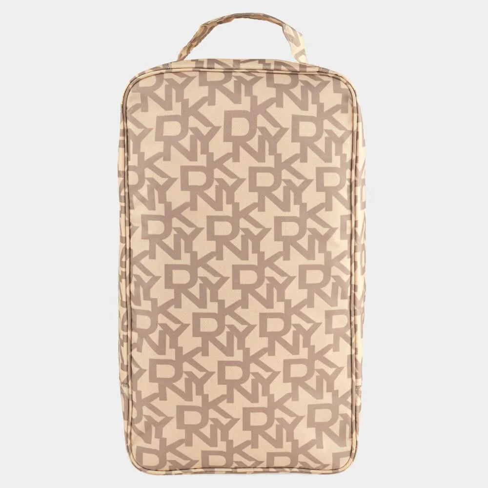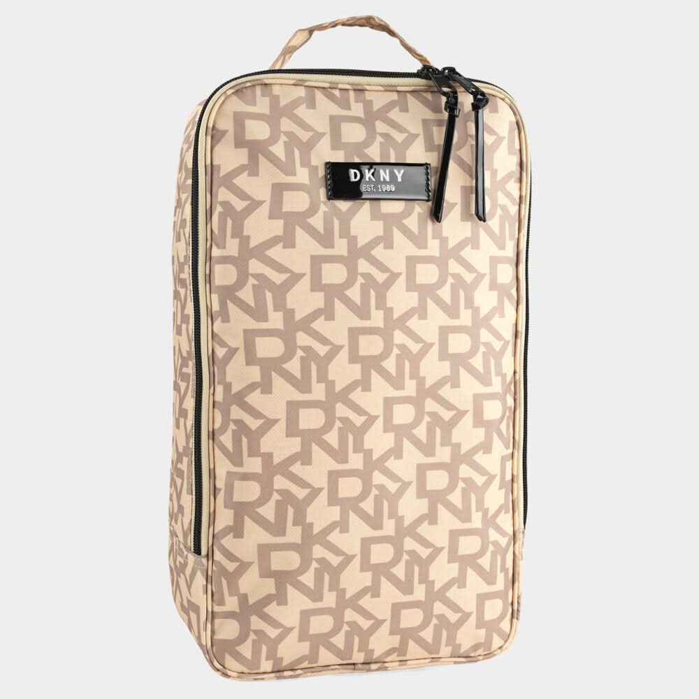 Con el estampado de letras de la marca, esta bolsa conserva el encanto distintivo de DKNY. Sus medidas de 36x22x11 cm ofrecen un amplio espacio para llevar tus zapatillas cómodamente y mantenerlas protegidas en todo momento.