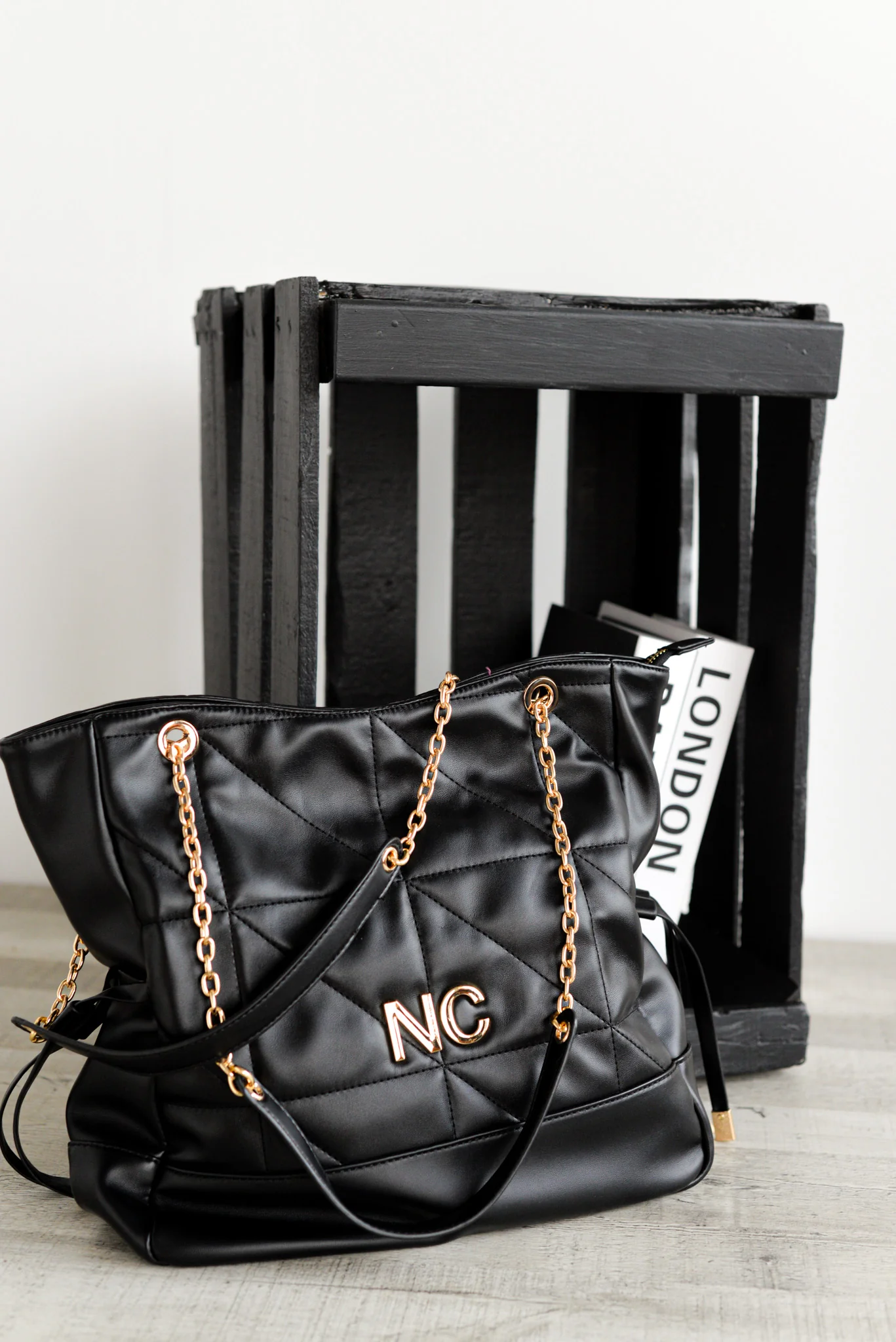 Este bolso de piel vegana lisa y suave en color negro combina elegancia atemporal y detalles modernos, convirtiéndose en un imprescindible de la colección.