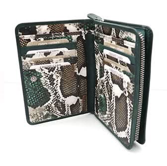 Dispone de 8 apartados para tarjetas, 4 huecos interiores, un departamento para billetes y monedero grande cerrado completamente a cremallera. Cartera elegante con un color bonito por fuera, y el diseño de animal print por dentro que le da un toque original. Logo de la marca grabado a fuego. Cierre solapa y clic metálico.