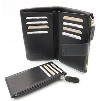 Dispone de 16 apartados para tarjetas, 8 de ellos vienen incorporados en una pieza extraíble (uno cerrado con cremallera), un departamento para billetes y un ultimo hueco lateral para monedas, con cierre de cremallera. La cartera tiene 2 apartados interiores y cierre solapa con clip y tirador de piel. Logo de la marca grabado a fuego.