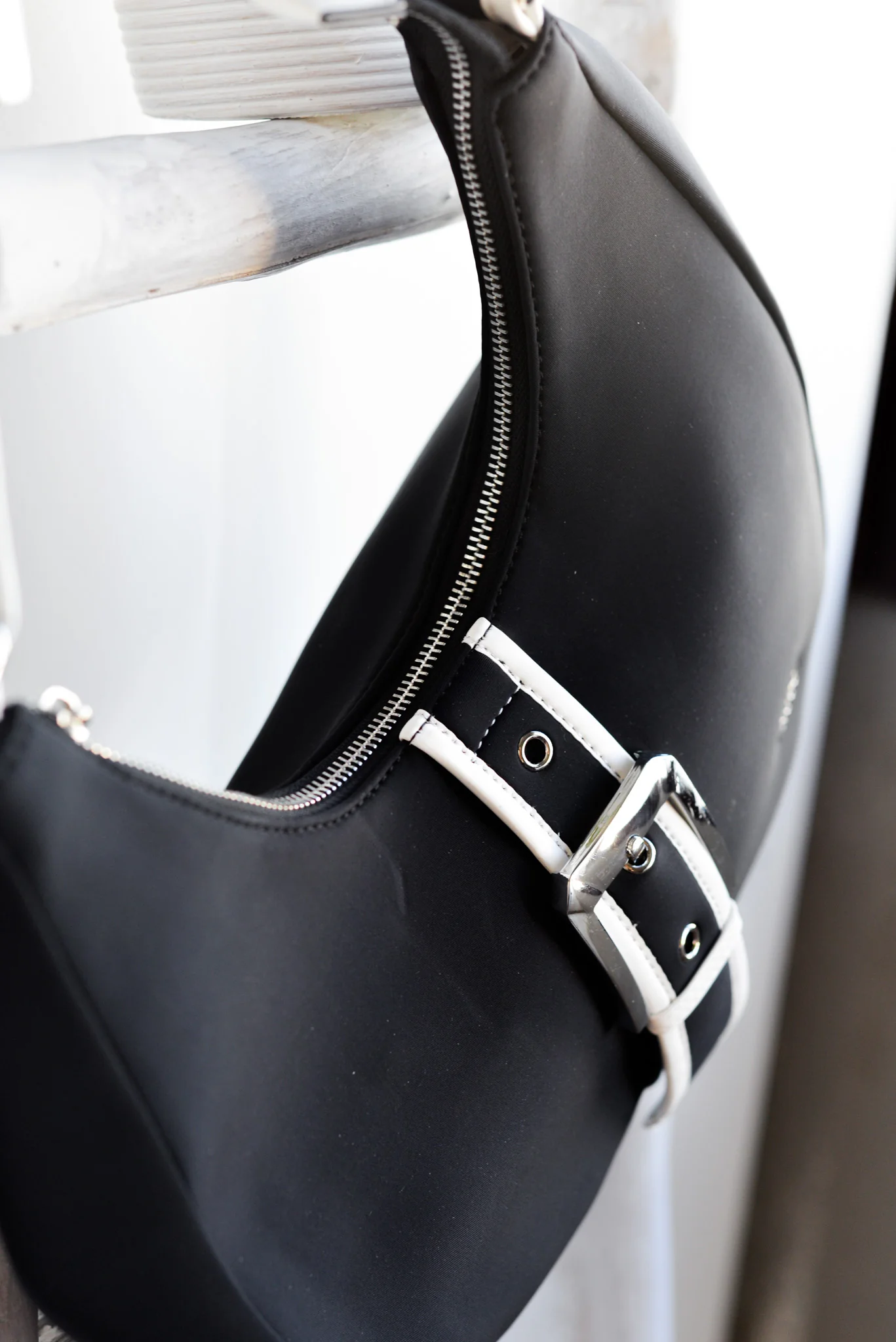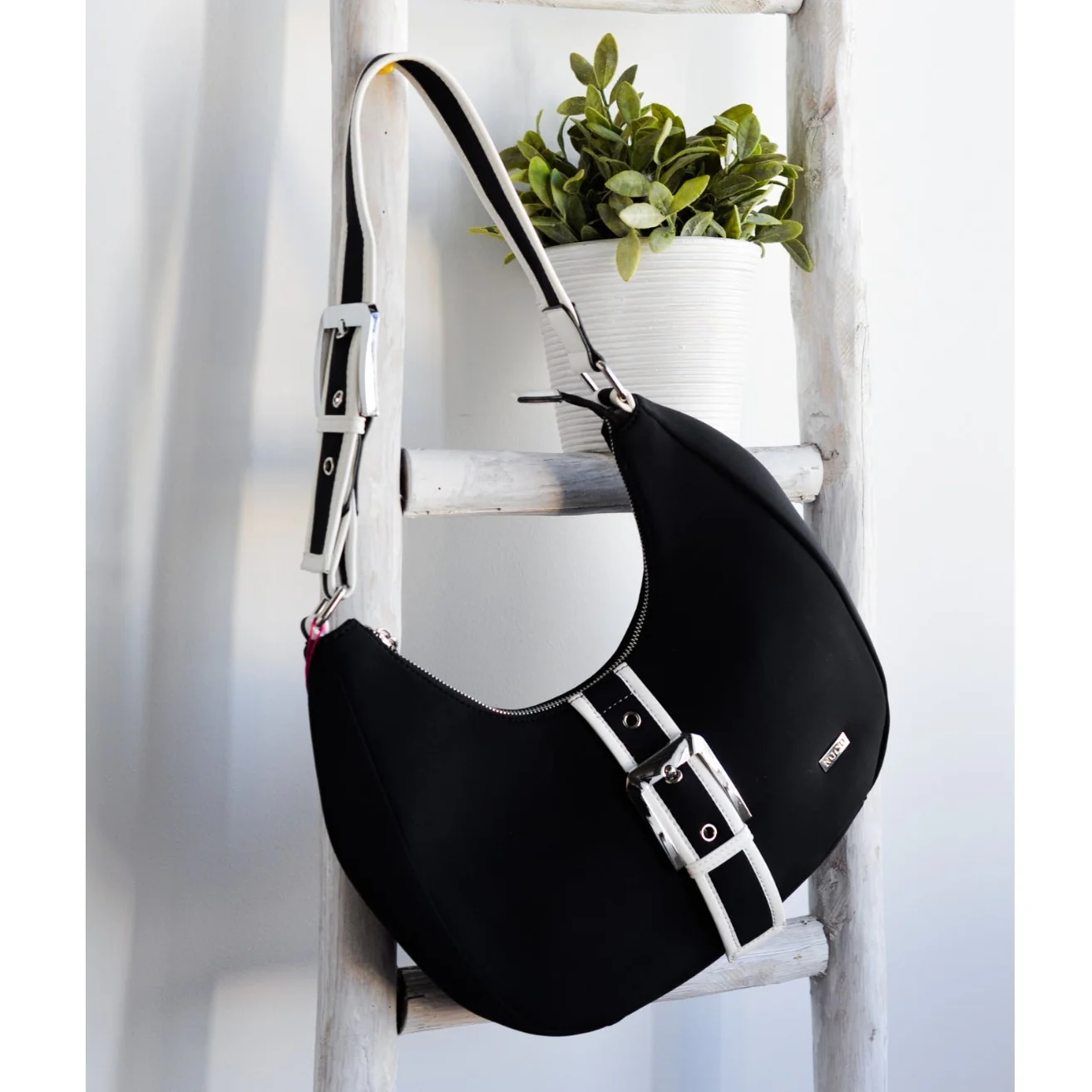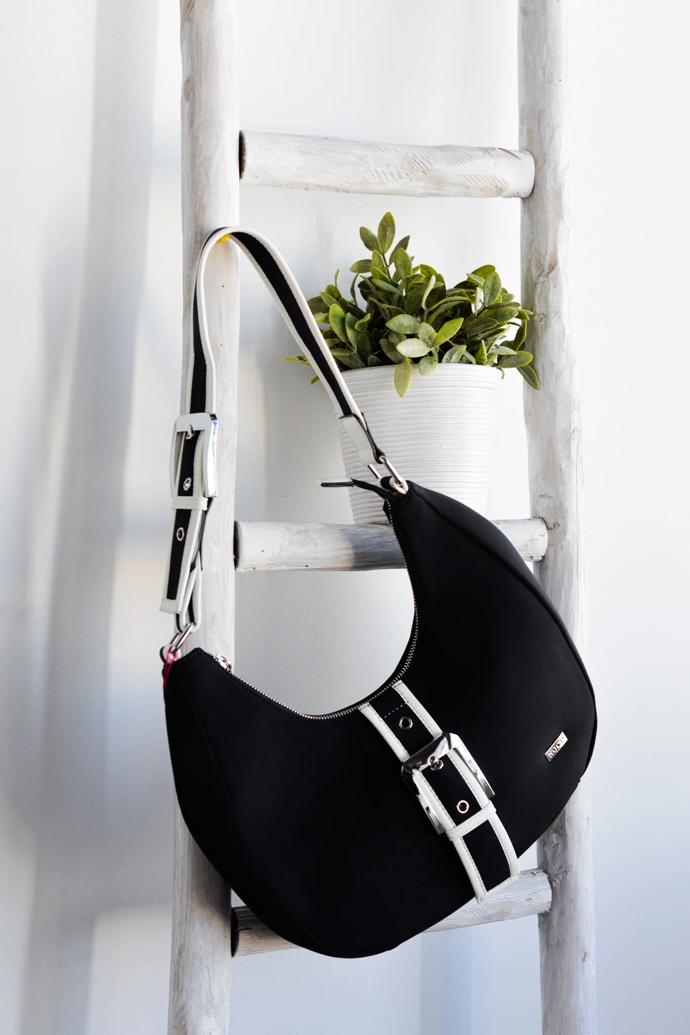 El neopreno negro le da una textura suave y ligera, mientras que los detalles en piel vegana blanca aportan un contraste llamativo y sofisticado. La góndola mediana es perfecta para quienes buscan un bolso con estilo, comodidad y sostenibilidad, ideal para un uso diario o para ocasiones más especiales.