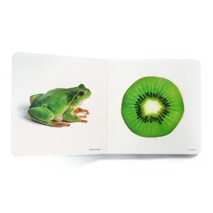 Libro de fotografías con imágenes reales que nos muestran imágenes relacionadas con el color primario verde, en la naturaleza y objetos cotidianos, pertenecen a la colección Mundo Natural de Nowordbooks.