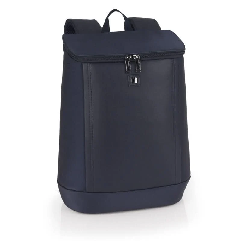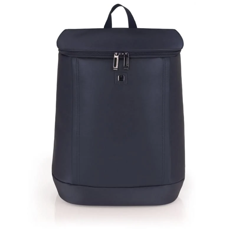 Mochila para portátil de 14» de piel sintética, azul. El interior de la mochila está forrado y acolchado, con funda para portátil y organizador. Fabricada con material libre de plásticos PVC. Medidas: 34x42x14 cm. Volumen: 14,5 L
