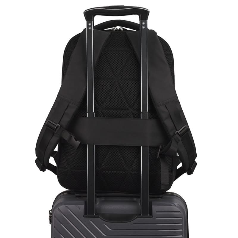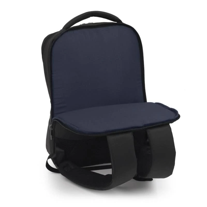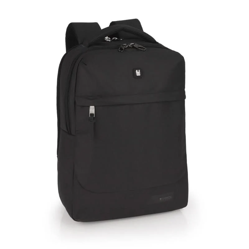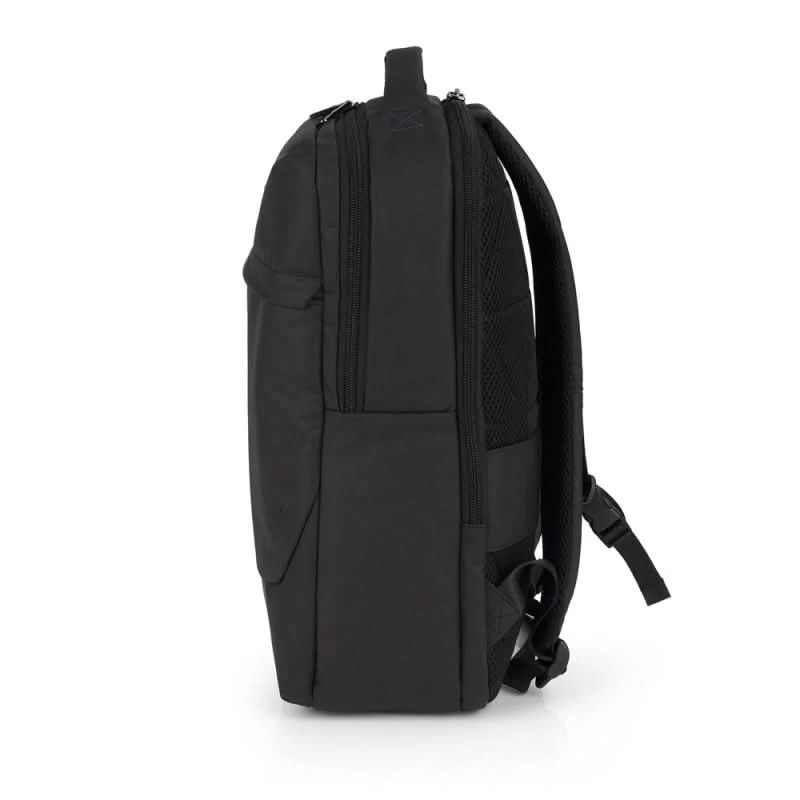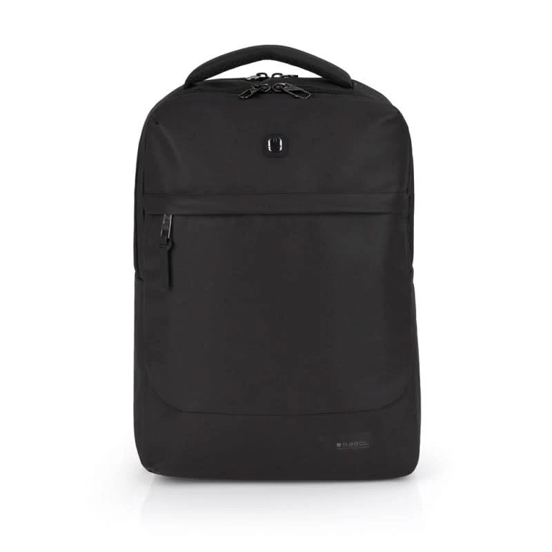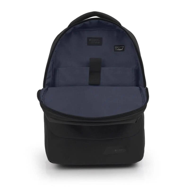 Mochila para portátil de 15,6» de poliéster resinado y piel sintética, negro, con dos compartimentos. El interior de la mochila está forrado y acolchado, con funda para portátil y organizador. Lleva cerradura de seguridad Fabricada con material libre de plásticos PVC. Medidas: 31x43x12 cm. Voluen: 14 L