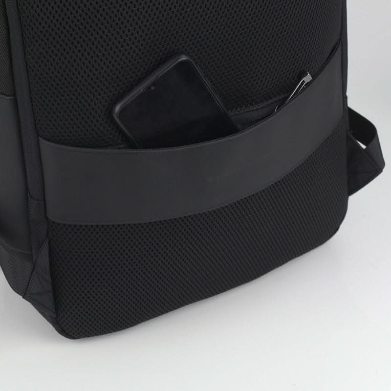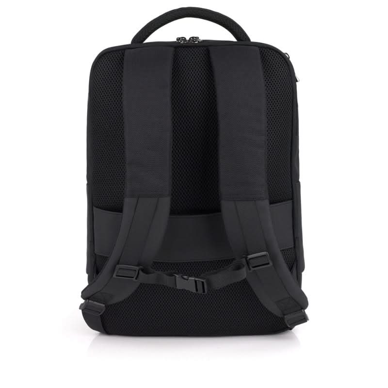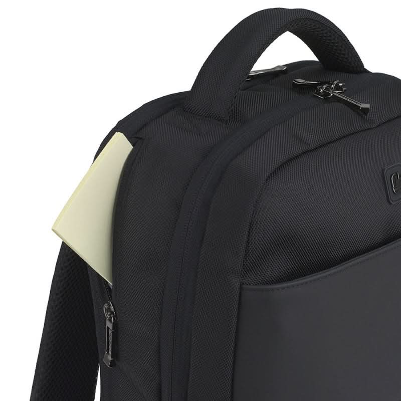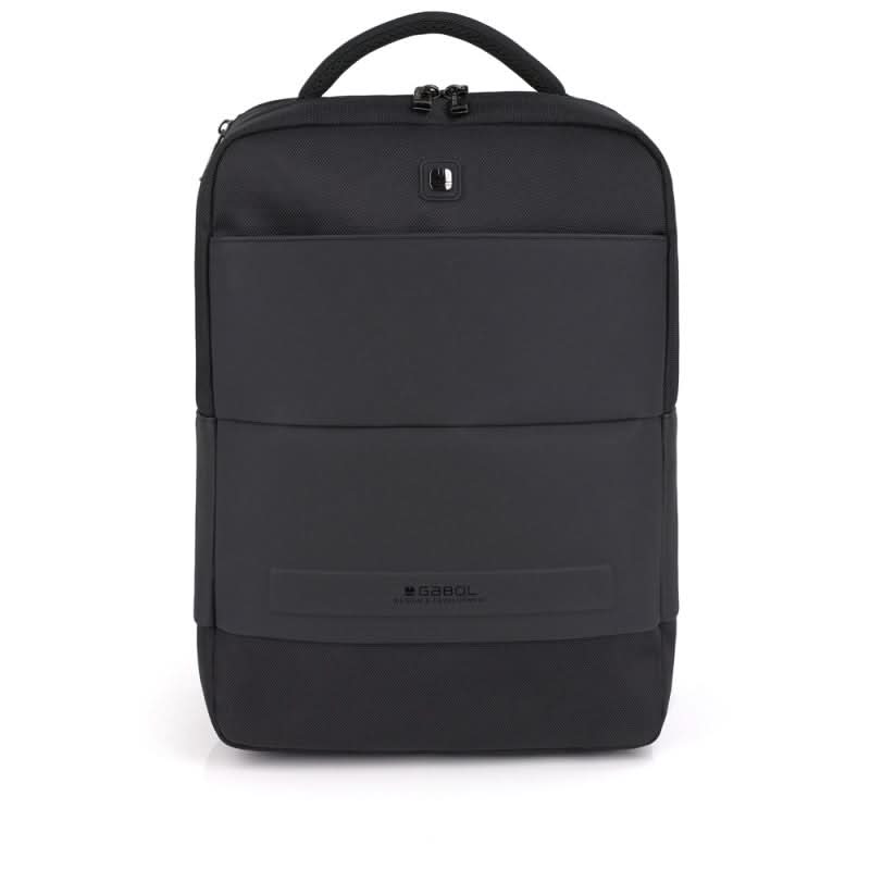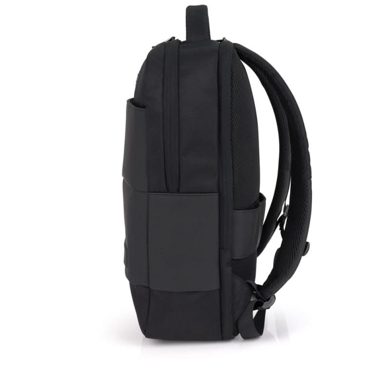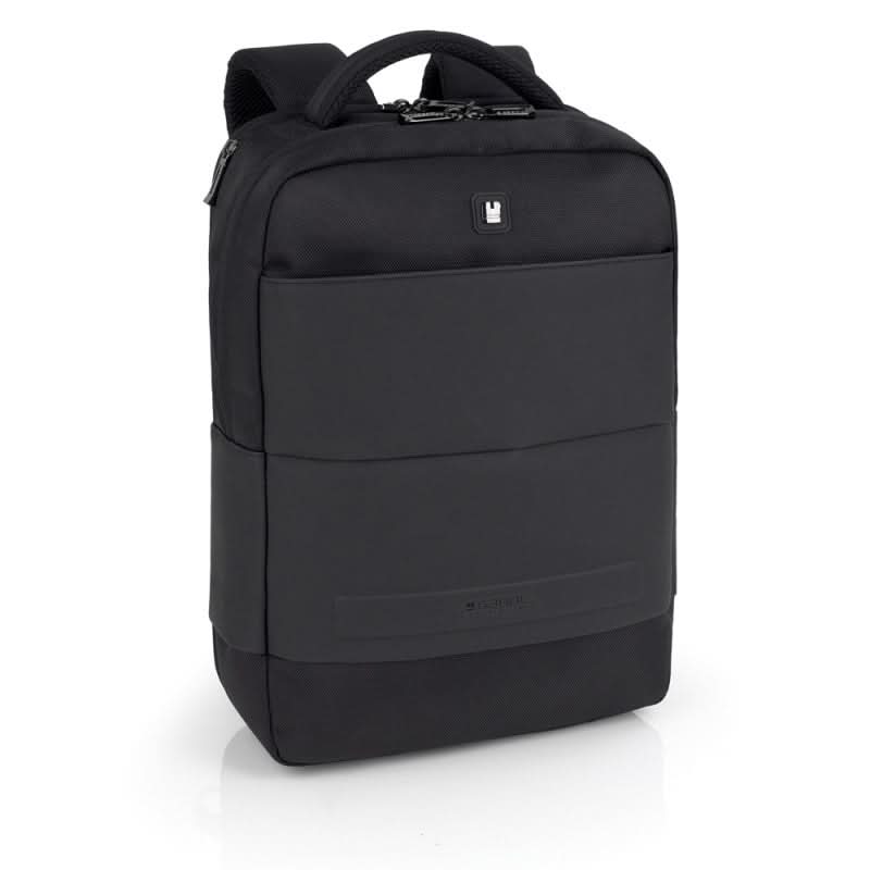 Mochila para portátil 15,6» de poliéster y piel sintética, negro, resistente al agua. El interior de la mochila está forrado y acolchado, con funda para portátil y organizador. Fabricada con material libre de plásticos PVC. Medidas: 31x43x12 cm. Volumen: 14 L