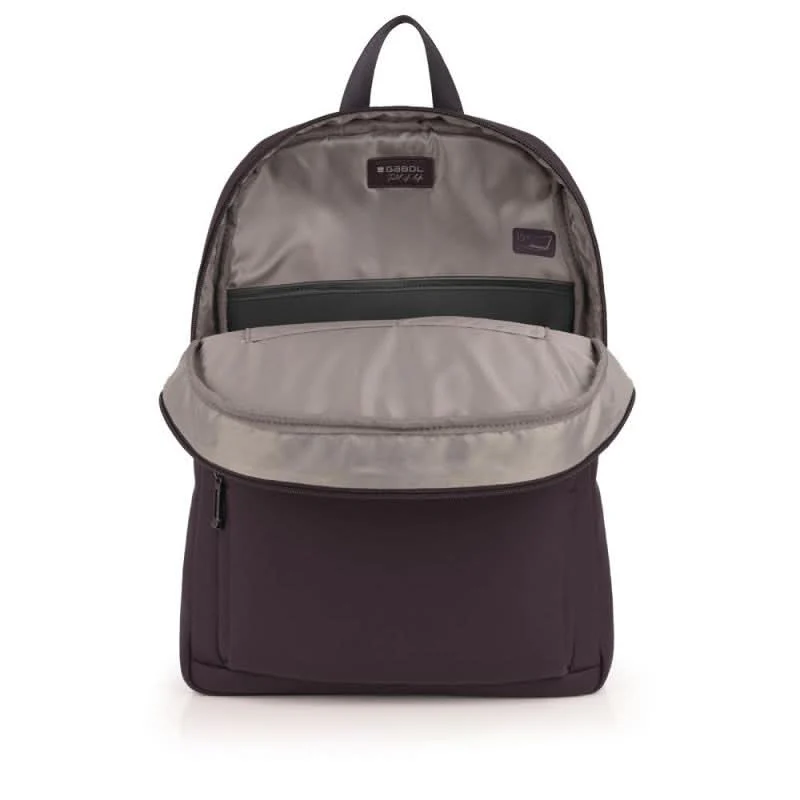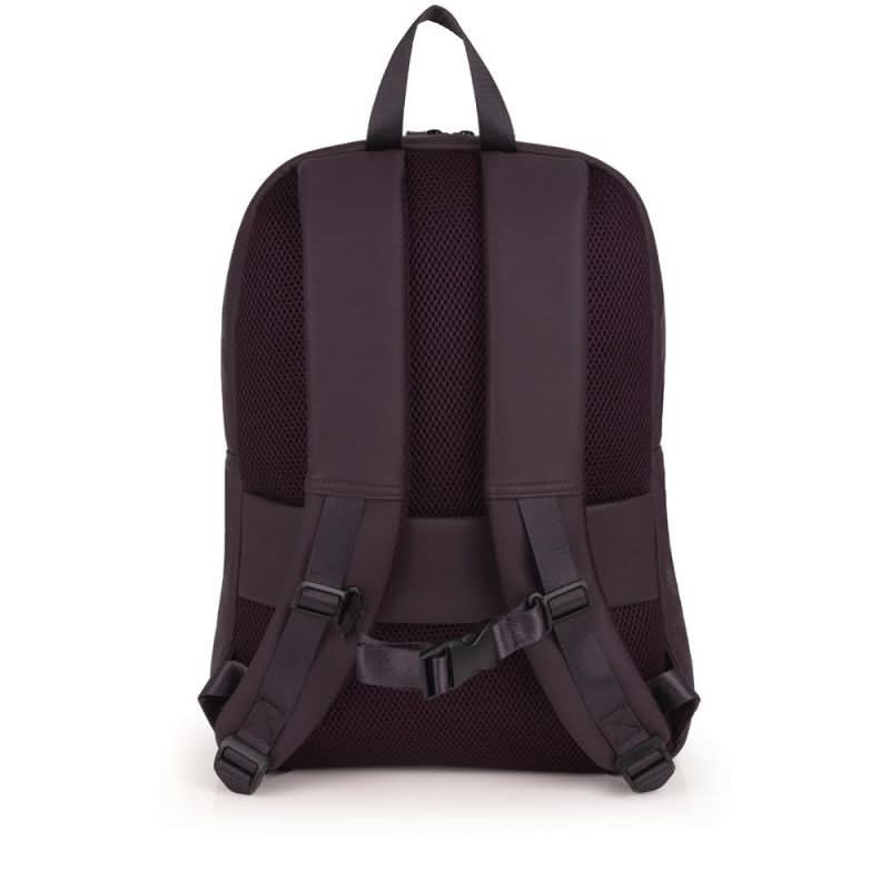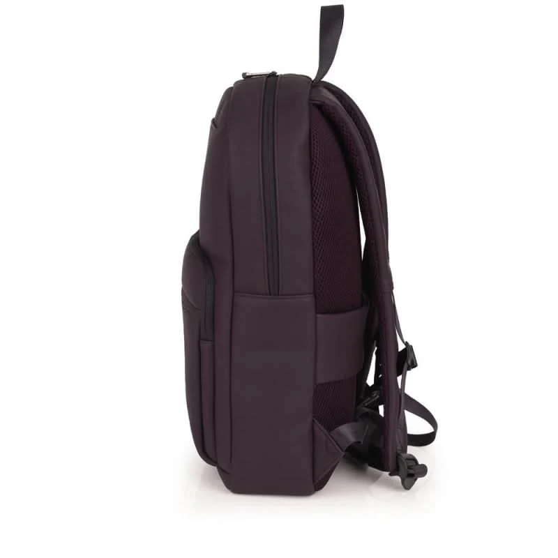 Mochila para portátil de 15,6´´. Material de piel sintética libre de plásticos PVC. Interior acolchado con compartimento para portátil y organizador. Acople para maleta en la parte trasera. Cinta de sujección al pecho. Medidas: 44x32x9 cm. Capacidad de 13,5 L.