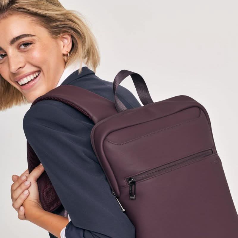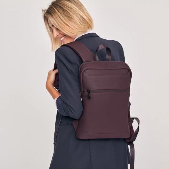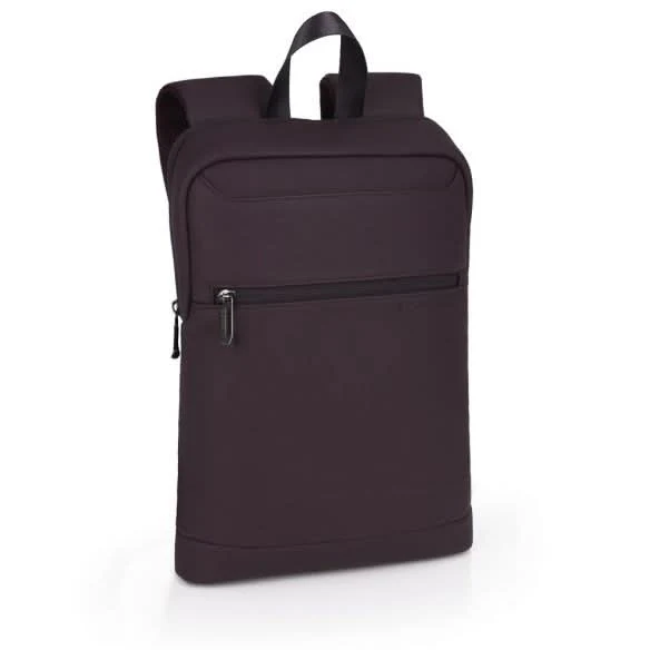 Mochila estrecha para portátil de 14´´. Material de piel sintética libre de plásticos PVC. Interior acolchado con compartimento para portátil y organizador. Medidas: 38x27x5 cm. Capacidad de 4,4 L.