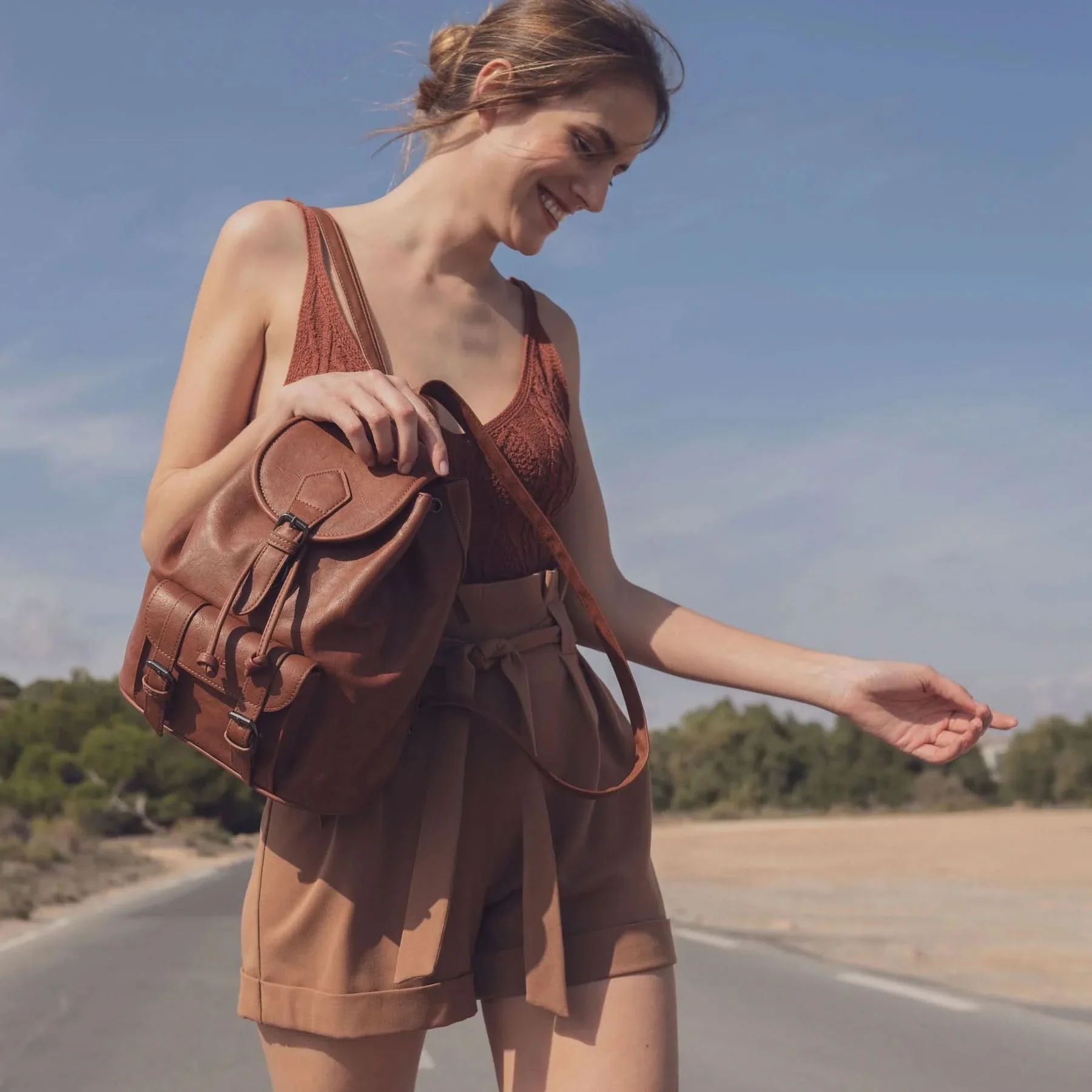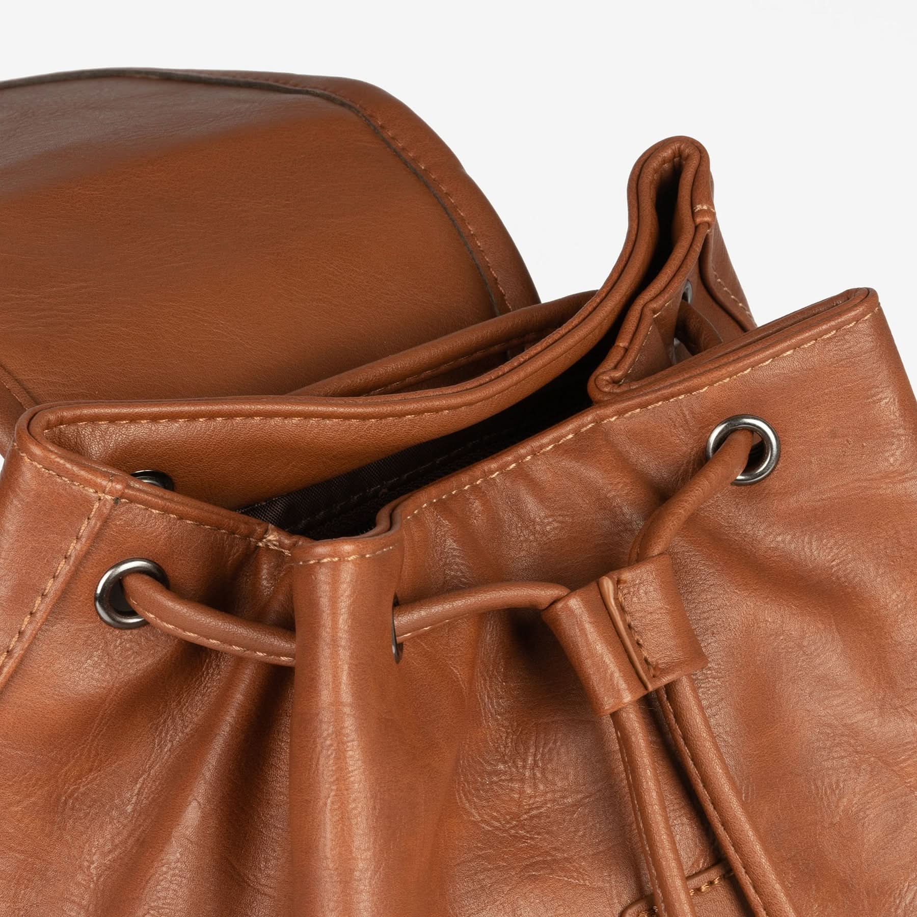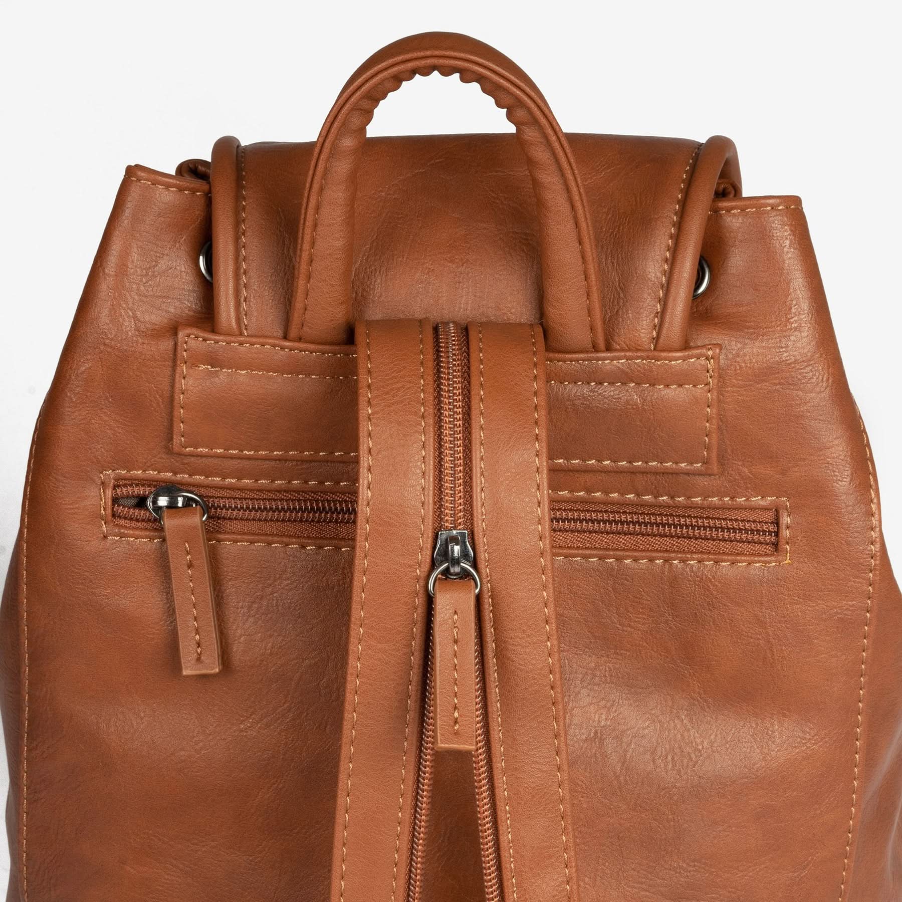 Mochila de corte clásico y muy funcional, Serie Mochilas. Acabada en polipiel de gran calidad. Interior de forro textil personalizado y un bolsillo con cremallera. El modelo lleva un bolsillo en la parte delantera, este hace el efecto de estar cerrado con una hebilla pero en realidad va con imán para que sea más rápido su uso. También dispone de un bolsillo trasero con cremallera. El cierre central es con una tira del mismo material de la mochila. El asa es multifunción, permite usarse como una sola o abriendo la cremallera se convierte en dos, para el uso tipo mochila.