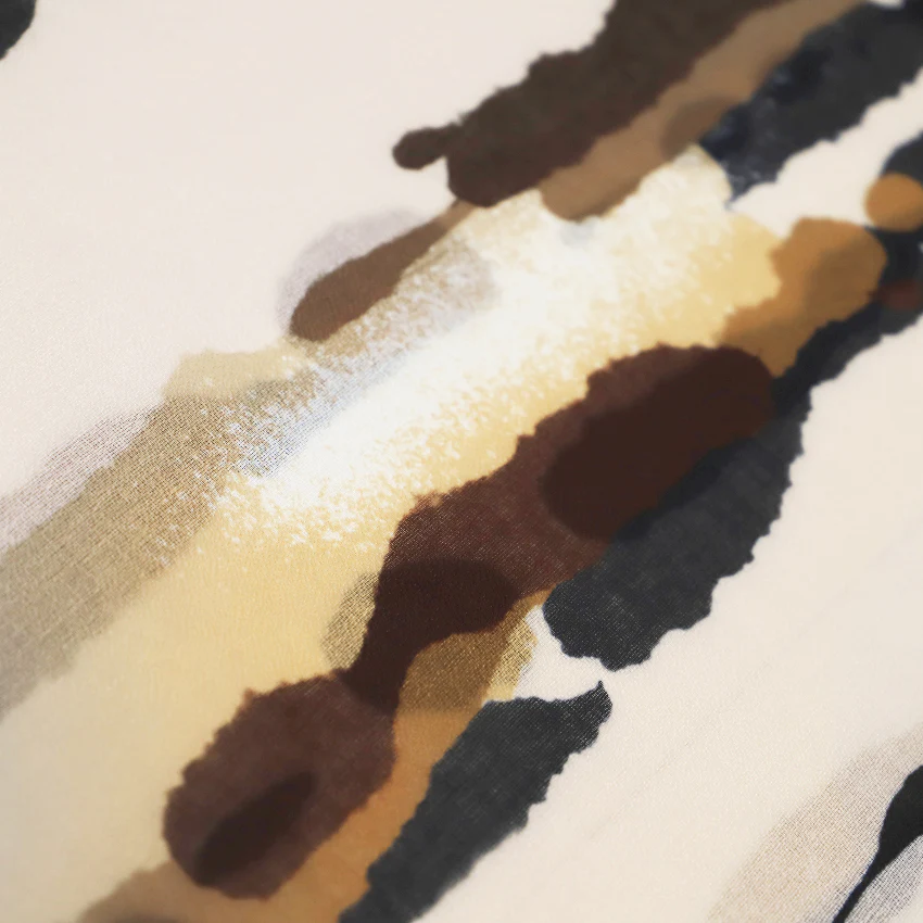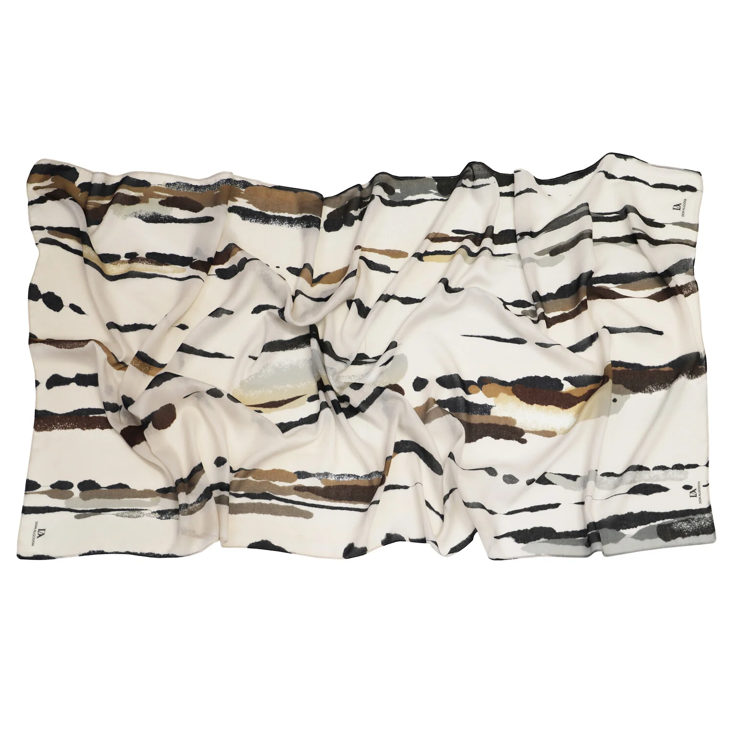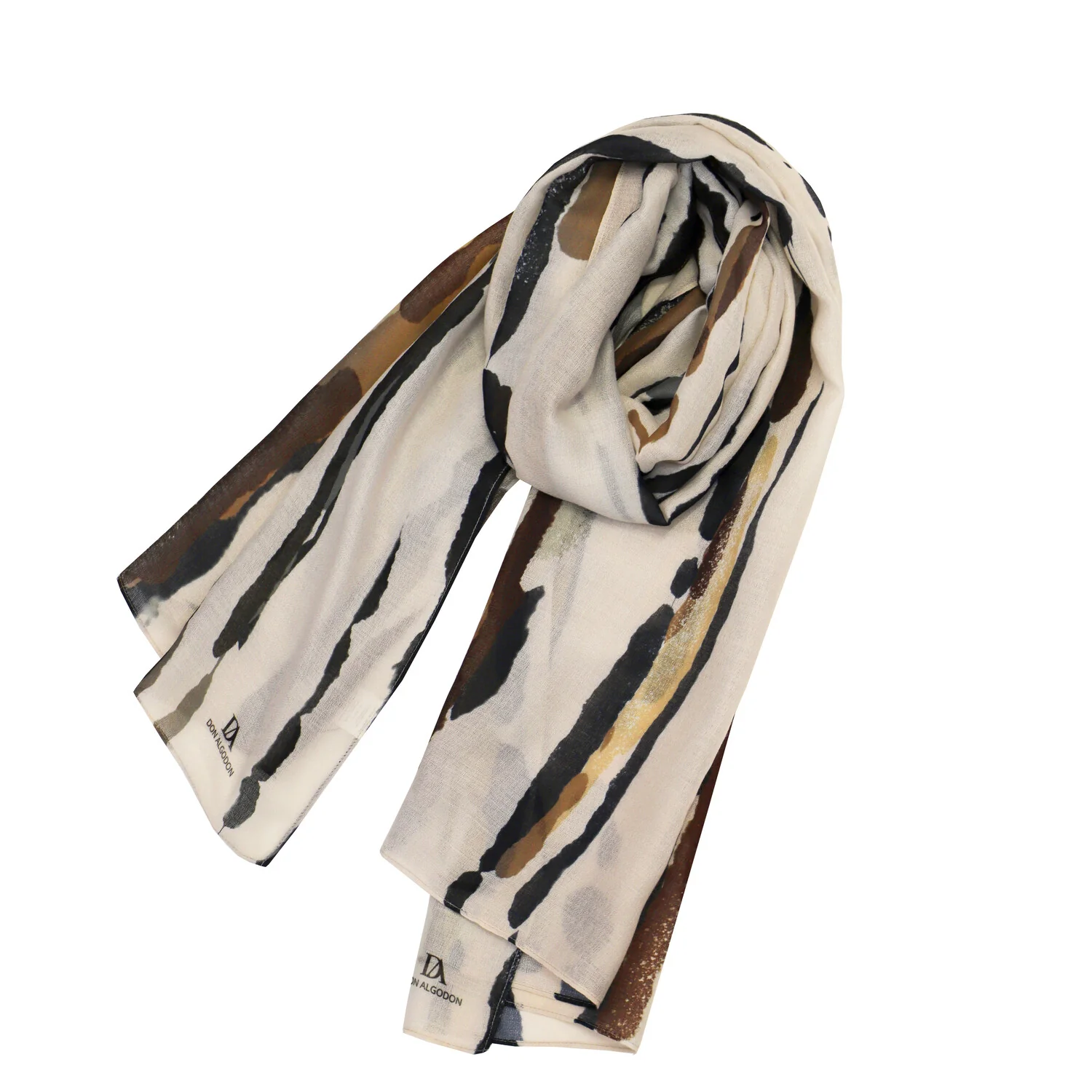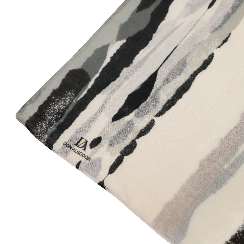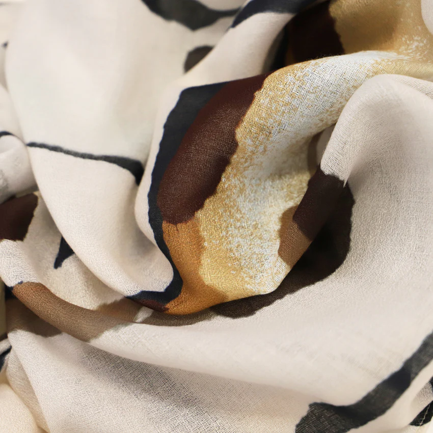 El Trazo combina líneas irregulares en tonos neutros, tierra y dorados, creando un estampado artístico que evoca pinceladas sobre lienzo. Un accesorio versátil y elegante que transforma cualquier look con un toque creativo.